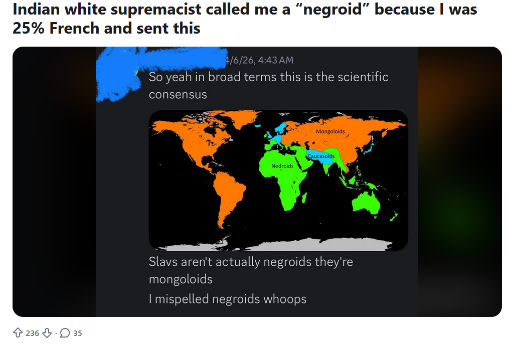 >>3235125 (OP)A sizeable percentage of the French population has/had a facial morphology that comes back as negroid when ran through a computer, we had a skull in our uni laboratory that was from a French military base that registered as negroid and when I had a conversation with my professor about his professional opinion he said he thought the individual came from Southern France