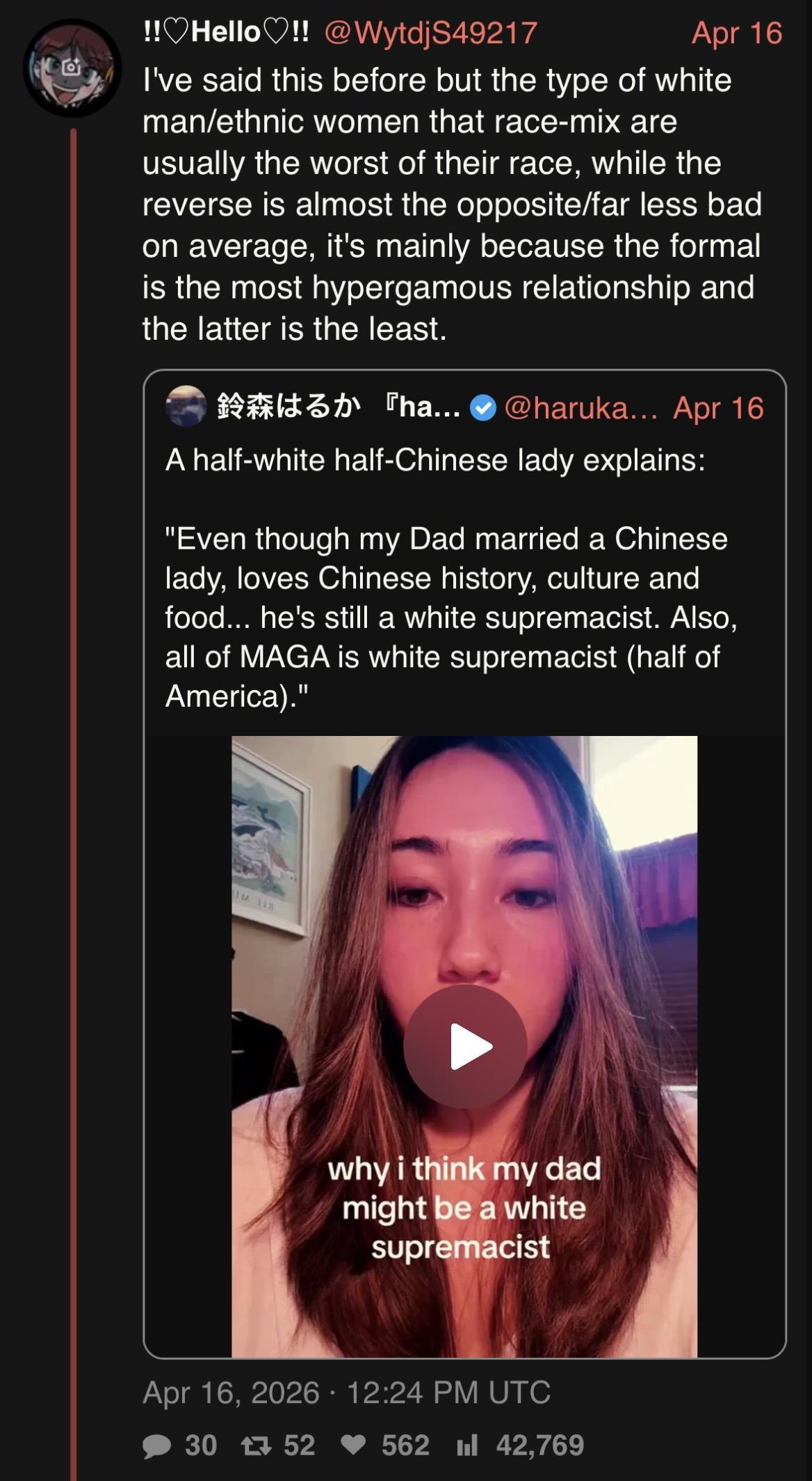 >>3253295He is wrong and retarded. He says that for example WMAF is le bad because the WM is the worst of his race because he cant get a WF and has to resort to AF (untrue because looks dont correlate much with important genetic qualities)