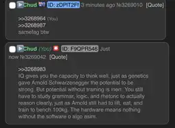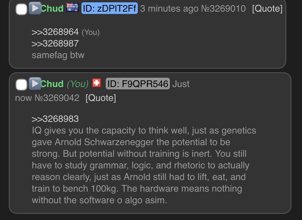 >>3268674Only double-digit-IQ people think intelligence is enough to think well. It's not. You also need to study grammar, logic and rhetoric. Being born Arnold Schwarzenegger is not enough to benchpress 100kg, you also need to eat food.