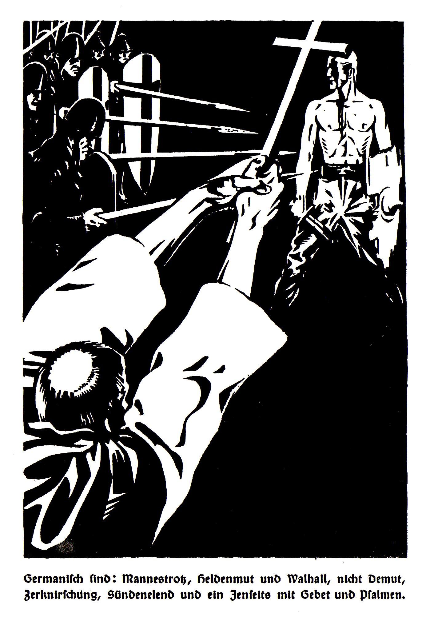 >Nobody of common sense would appoint to a leading post in such a movement some Teutonic Methuselah who had been ineffectively preaching some idea for a period of forty years, until himself and his idea had entered the stage of senile decay. Furthermore, only a very small percentage of such people join a new movement with the intention of serving its ends unselfishly and helping in the spread of its principles. In most cases they come because they think that, under the aegis of the new movement, it will be possible for them to promulgate their old ideas, to the misfortune of their new listeners. Anyhow, nobody ever seems able to describe what exactly these ideas are. It is typical of such persons that they rant about ancient Teutonic heroes of the dim and distant ages, stone axes, battle spears and shields, whereas in reality they themselves are the woefullest poltroons imaginable. For those very same people who brandish Teutonic tin swords that have been fashioned carefully according to ancient models and wear padded bearskins, with the horns of oxen mounted over their bearded faces, proclaim that all contemporary conflicts must be decided by the weapons of the mind alone. And thus they skedaddle when the first communist cudgel appears. Posterity will have little occasion to write a new epic on these heroic gladiators. I have seen too much of that kind of people not to feel a profound contempt for their miserable play-acting. To the masses of the nation they are just an object of ridicule; but the Jew finds it to his own interest to treat these folk-lore comedians with respect and to prefer them to real men who are fighting to establish a German State. And yet these comedians are extremely proud of themselves. Notwithstanding their complete fecklessness, which is an established fact, they pretend to know everything better than other people; so much so that they make themselves a veritable nuisance to sincere and honest patriots, to whom not only the heroism of the past is worthy of honour but who also feel bound to leave examples of their own work for the inspiration of the coming generation. Among those people there were some whose conduct can be explained by their innate stupidity and incompetence; but there are others who have a definite ulterior purpose in view. Often it is difficult to distinguish between the two classes. The impression which I often get, especially of those so-called religious reformers whose creed is grounded on ancient Germanic customs, is that they are the missionaries and proteges of those forces which do not wish to see a national revival taking place in Germany. All their activities tend to turn the attention of the people away from the necessity of fighting together in a common cause against the common enemy, namely the Jew. - Adolf Hitler, Mein Kampf