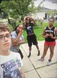 Pictured: talented young White man John Doyle of The John Doyle Show, with three black American women in Detroit, the home town of John Doyle.