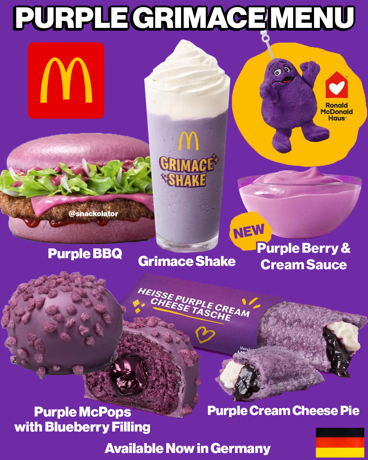 >McDonald's just dropped a Grimace MENU with a PURPLE BURGER, Grimace Shake, purple sauce, pie, and mini donuts?! You already know this lineup is WAY too good to be in the US… it's in Germany.