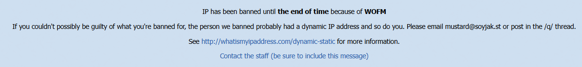 >If you couldn't possibly be guilty of what you're banned for, the person we banned probably had a dynamic IP address and so do you. Please email mustard@soyjak.st or post in the /q/ thread.