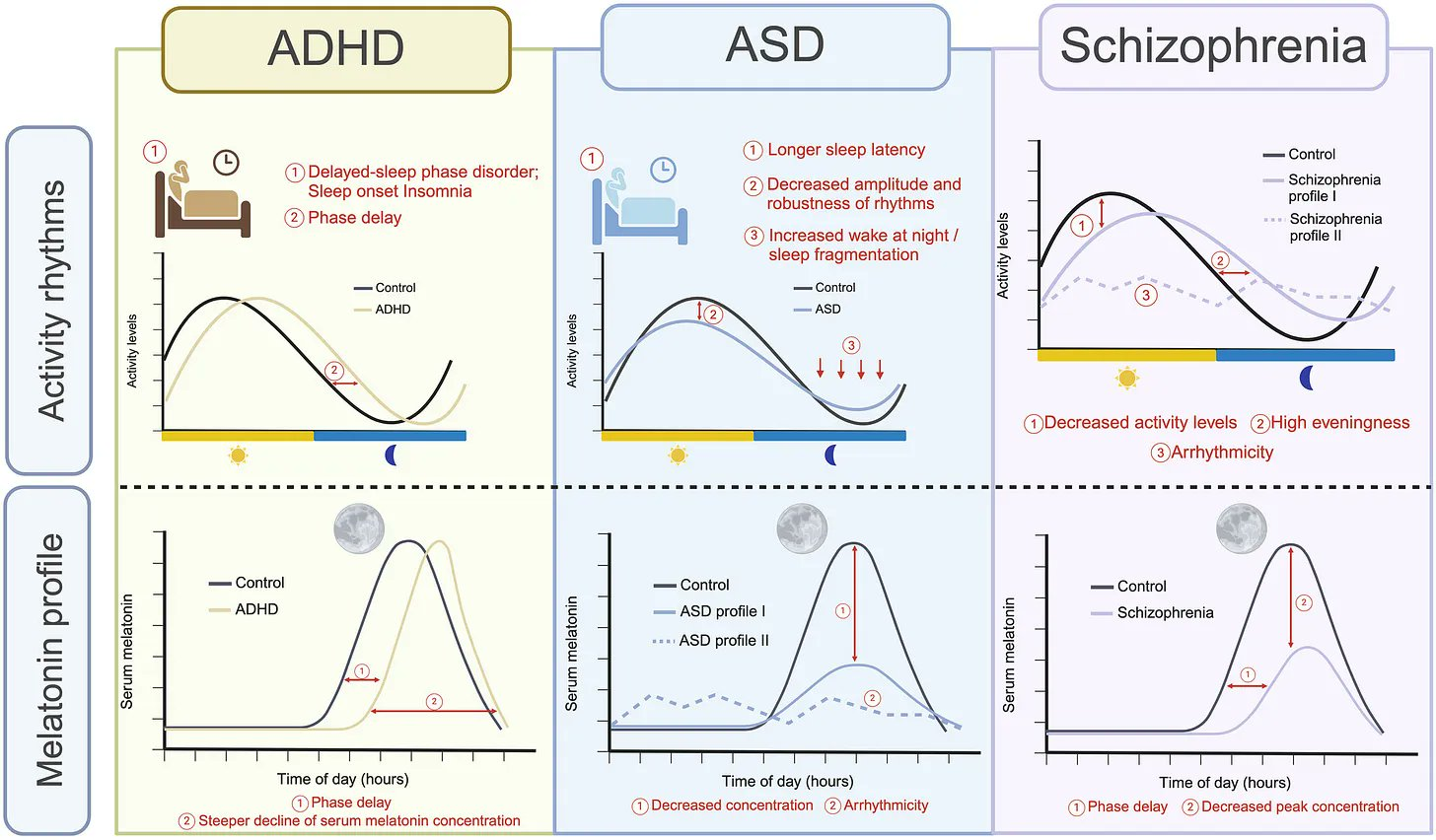 In ADHD the melatonin release is delayed which will present as 'insomnia' in ppl with adhd