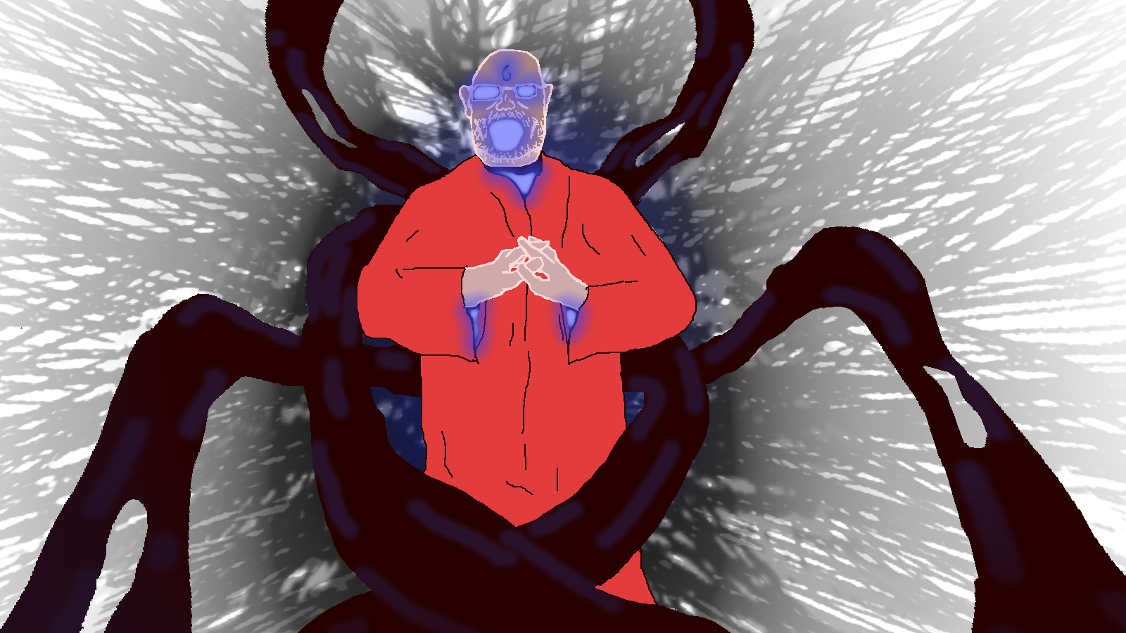 We starts with a black screen, then visuals slowly fade in and the narrator starts talking. We are shown Terry Davis drawing raisinson on a large paper, raisinson is never fully shown, just an eye or the mouth, then we are shown raisinson being contained with the USB in the soysylum and some more soysylum lore. It then cuts to the death of Terry Davis, the voice of admin 6 says something like ’your mission is done, you are no longer needed’, he is then hit by a train.
