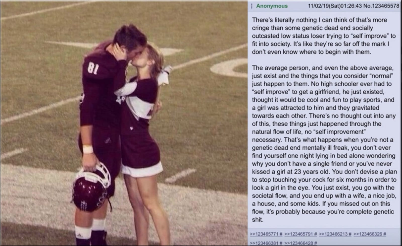 >>85857 (OP)OP serious question when’s the last time you’ve had a conversation with a woman (outside of work and family). Women aren’t a question waiting to be solved or something you need to conquer, so lookism isn’t a sustainable solution to having healthy and happy relations with women. You don’t like other people because they don’t share your micro interests? That’s because lookism is flawed- if a poor ugly dude can get a decent relationship (because he has developed a good personality, something you have yet to do), then that means that you can too so you have no excuses. No, women are not out to get you, and maybe if you started talking to more of them you’d understand this