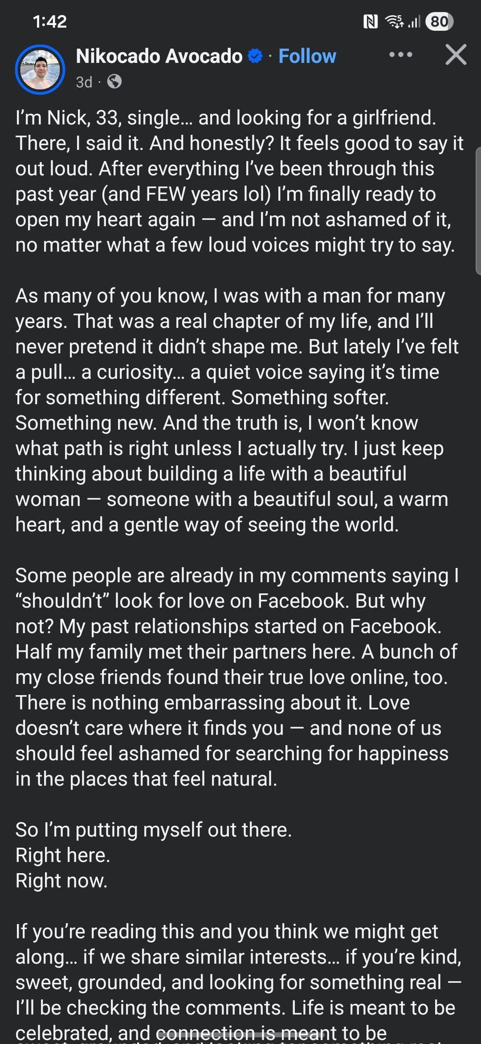 nikocado avocado is looking for a girlfriend on facebook