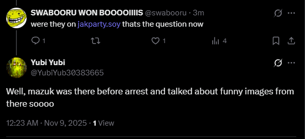 https://soyjak.st/soy/thread/13896732.html#q13900407 (One of xhis telegroom cord xisters, yubi yubi, randomly appearing to me)