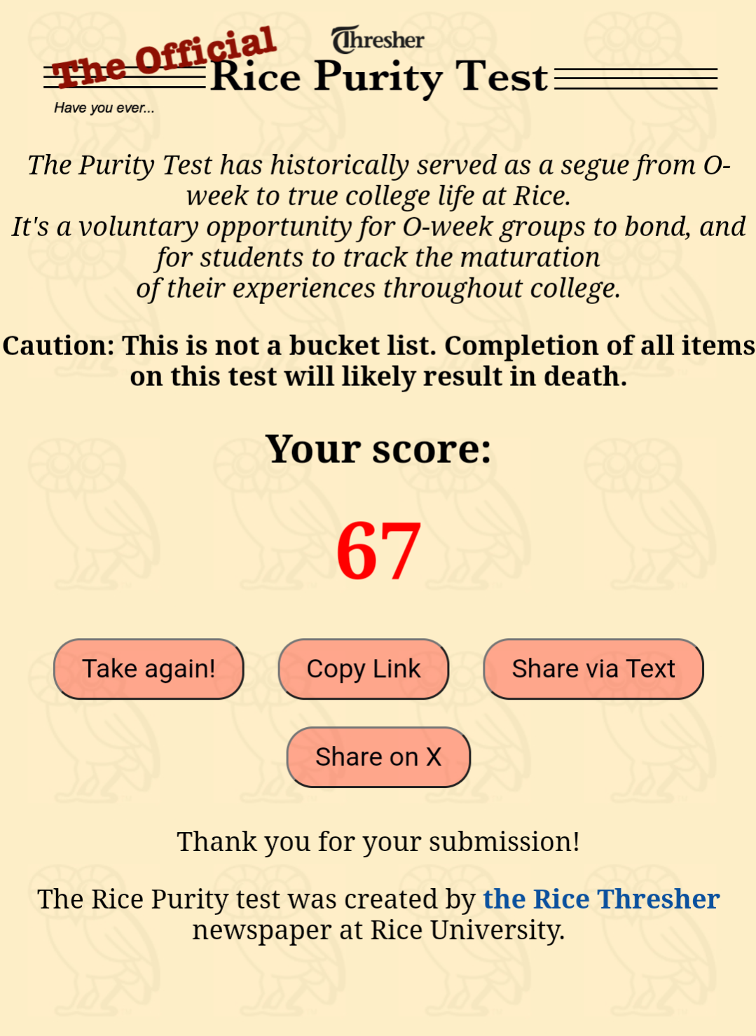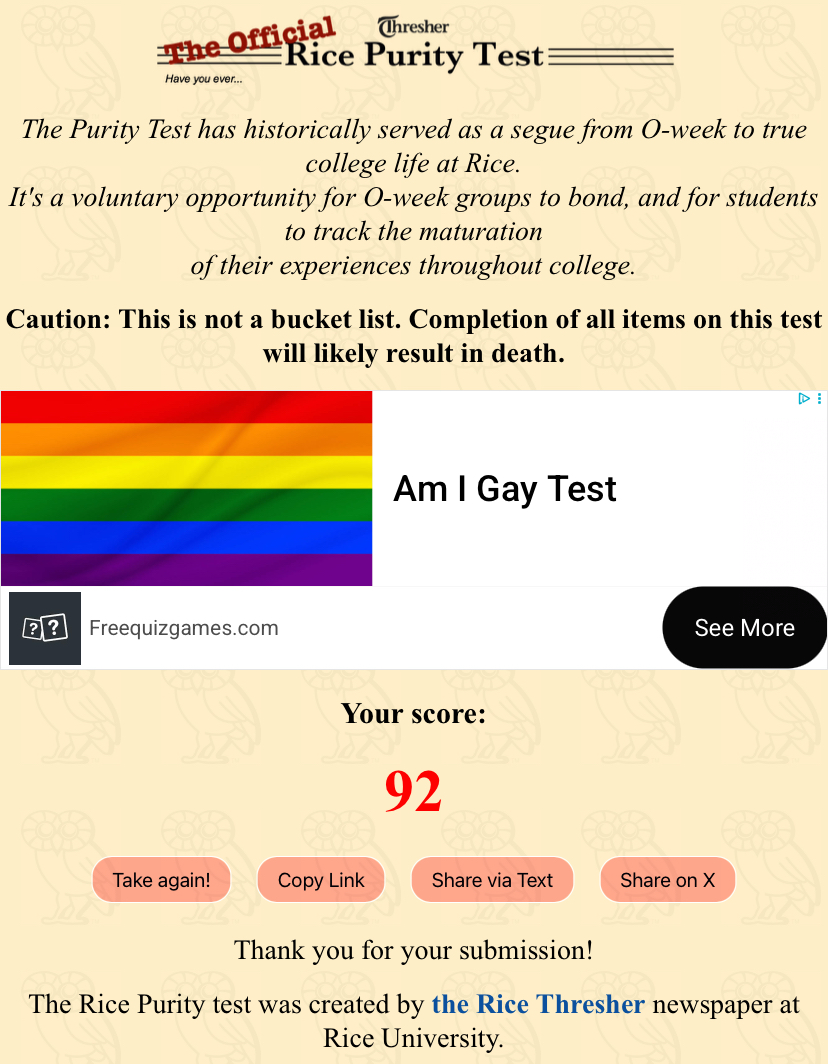 Got a 32, but half of these are checked off if youβve been in a long term relationship. Thereβs like 4 questions of βhas a chick grabbed your ballsβ