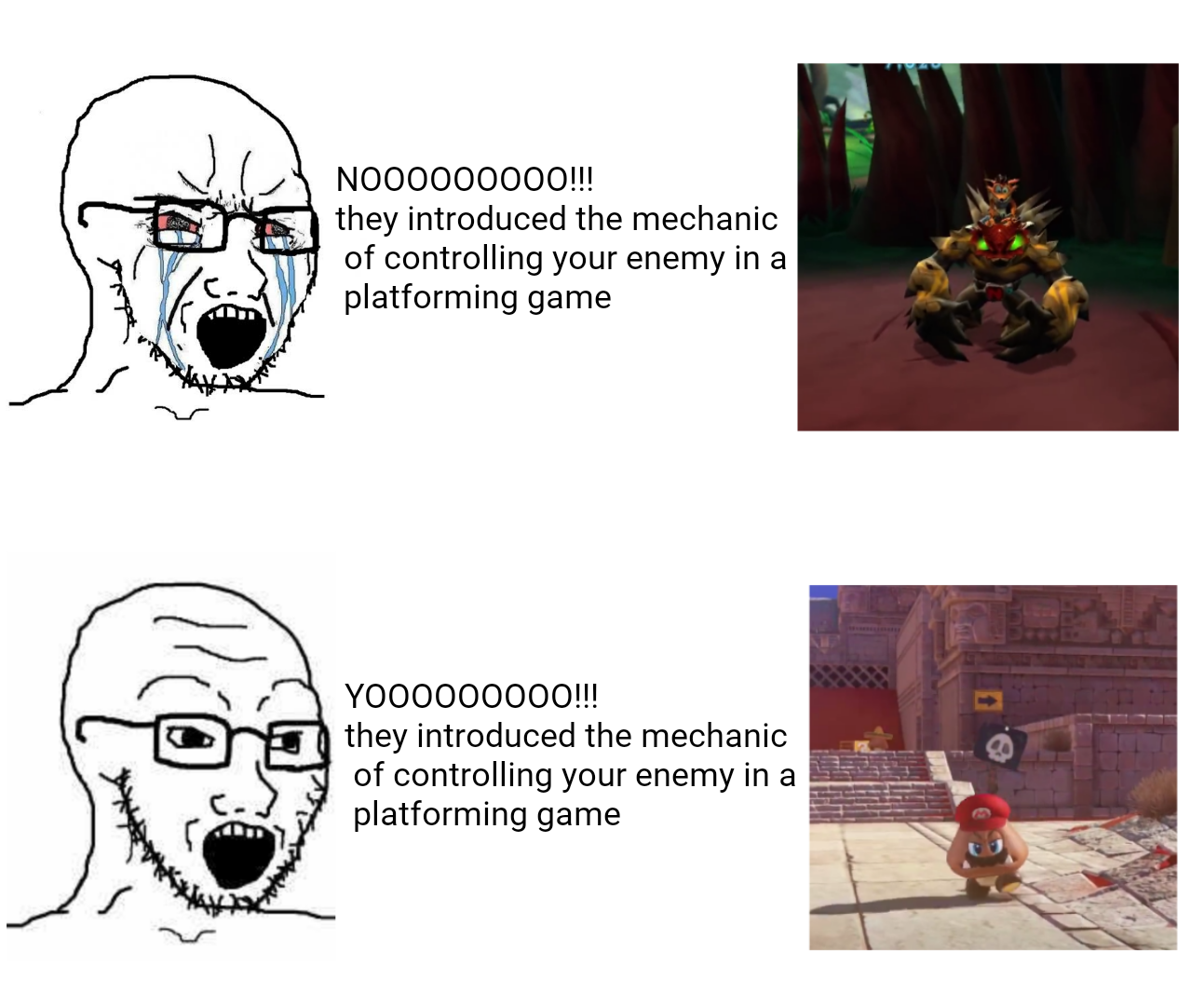 Honestly tho it does well translating crash into a different type of game, if you inspect it closer you will come to realize that (like how many of the totems in the levels are references to totems in the original crash trilogy), the mojo room is kind of an evolution of the crash minigames or bonus rooms from which you would get wumpa fruit, the moveset is greatly expanded which is in my opinion to crashes benefit, the titans were never seen before but made the game extremely unique, even outside of the crash franchise as this kind of game where you can use your enemies against each other hasn't been attempted much other places (also mario oddysey is soyboy) The music and environment/level designs are massive and vast, they feel like living, breathing worlds and all the interactive elements just add to that, the graphics have aged very well and even for a ps2-era game it is very impressive, the variety in these games is also unparalleled in any other crash games, in the first level you're exploring the forests of wumpa island, in another one you're in a steampunk desert, an industrial freezer, on a beach with a giant stadium, in a volcano filled madness and then a huge facility that floats in the air shaped like cortex the parkour and many other classic elements are fine, they are still plentiful in the game and there are just new features added. the first level before the titans has plenty of platforming and it's fun, doesnt feel unfair. the levels are also open unlike the old crash games which would basically have you walking down tunnels, there are plenty of collectibles and many difficulties and stuff to keep you coming back to the game, overall really good overhated game that was just hated for being original and not "crash" enough