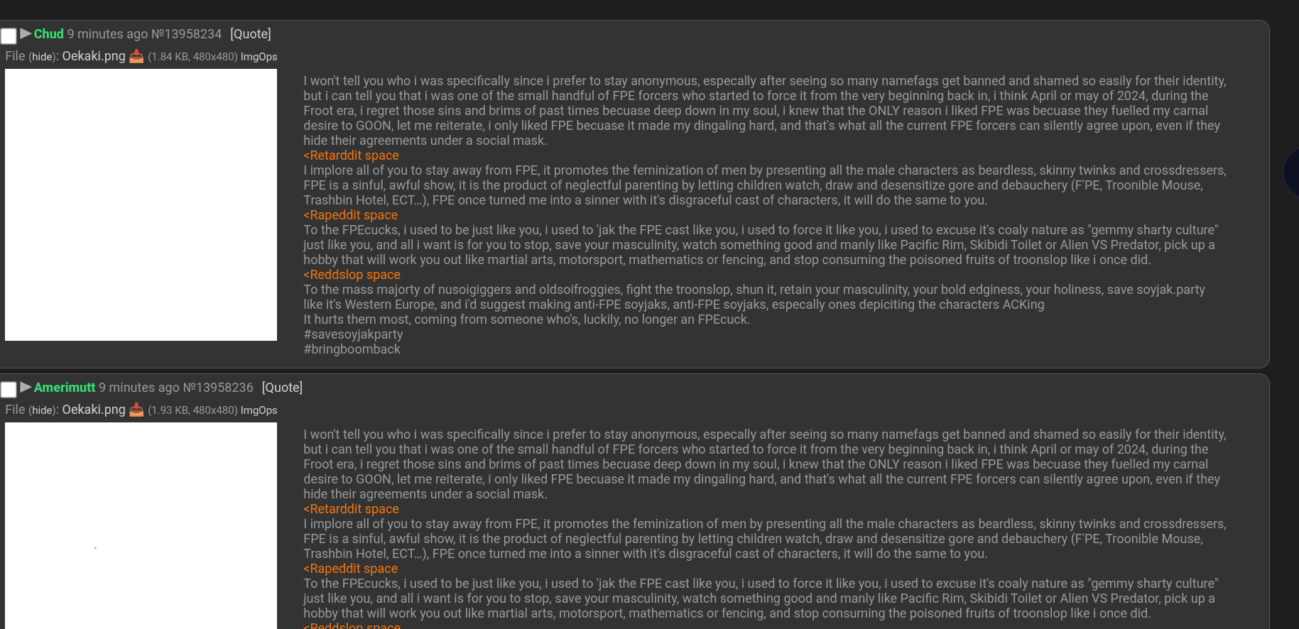 I won't tell you who i was specifically since i prefer to stay anonymous, especally after seeing so many namefags get banned and shamed so easily for their identity, but i can tell you that i was one of the small handful of FPE forcers who started to force it from the very beginning back in, i think April or may of 2024, during the Froot era, i regret those sins and brims of past times becuase deep down in my soul, ever since i saw that fucking fundamental paper whateverthefuck video something changed in me. every time i go to bed now i have the same dream of her raping my anus while calling me "fag" or "bitchboy". i swear i wasn't into this before but i think i kinda am now. i want her to rail me with that big futa cock for hours while abusing me, there's no helping it. most of my days now are spent fapping to miss circle futa on male porn and using janitor ai to let her rape me. god save me.