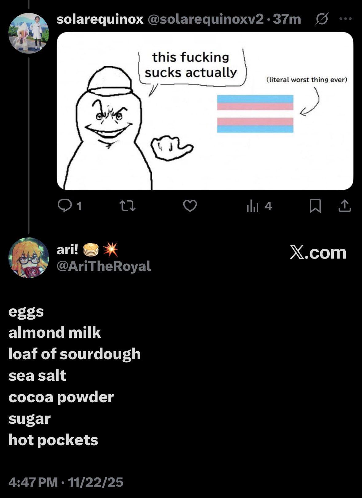 eggs, almond milk, loaves of sourdough, sea salt, cocoa powder, sugar and hot pockets are all troonslop now