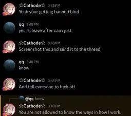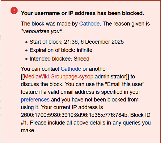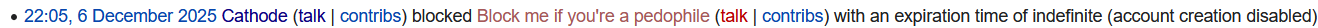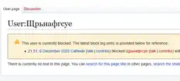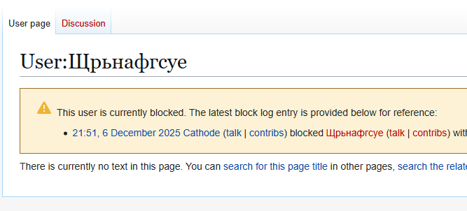 >21:51 Cathode talk contribs blocked Щрьнафгcуe talk contribs with an expiration time of indefinite (account creation disabled) (Google translate won't fucking work on me.)