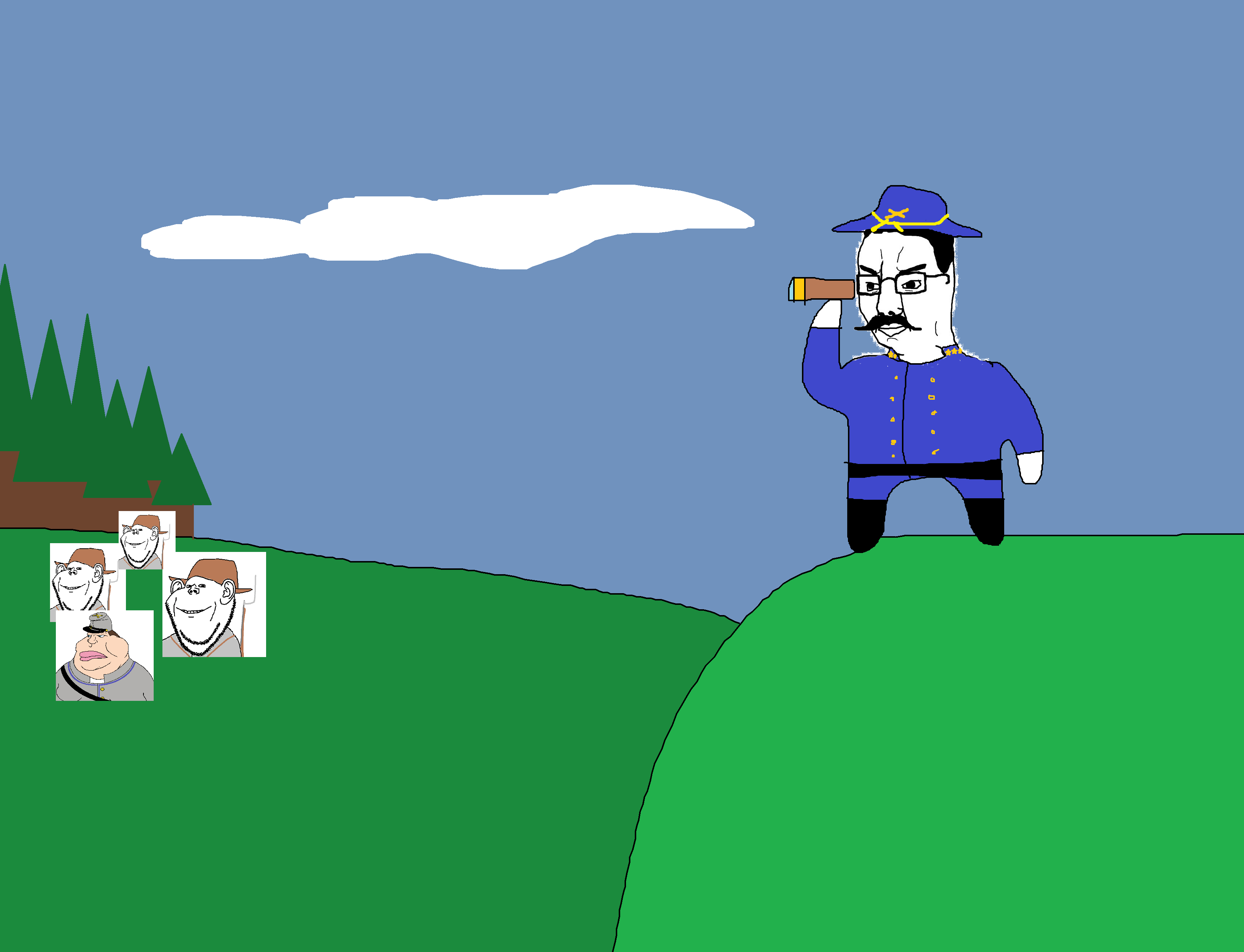 >>14324424The 'teens in blue succesfully destroy the Cobfederate batteries, to the dismay of the soyldiers in grey. The retreating Soyunionist regiment have been slowed down too much by their work on the cannons, and the Cobfederates who just arrived on the hill give them no quarter. Only a few make their way back unharmed.