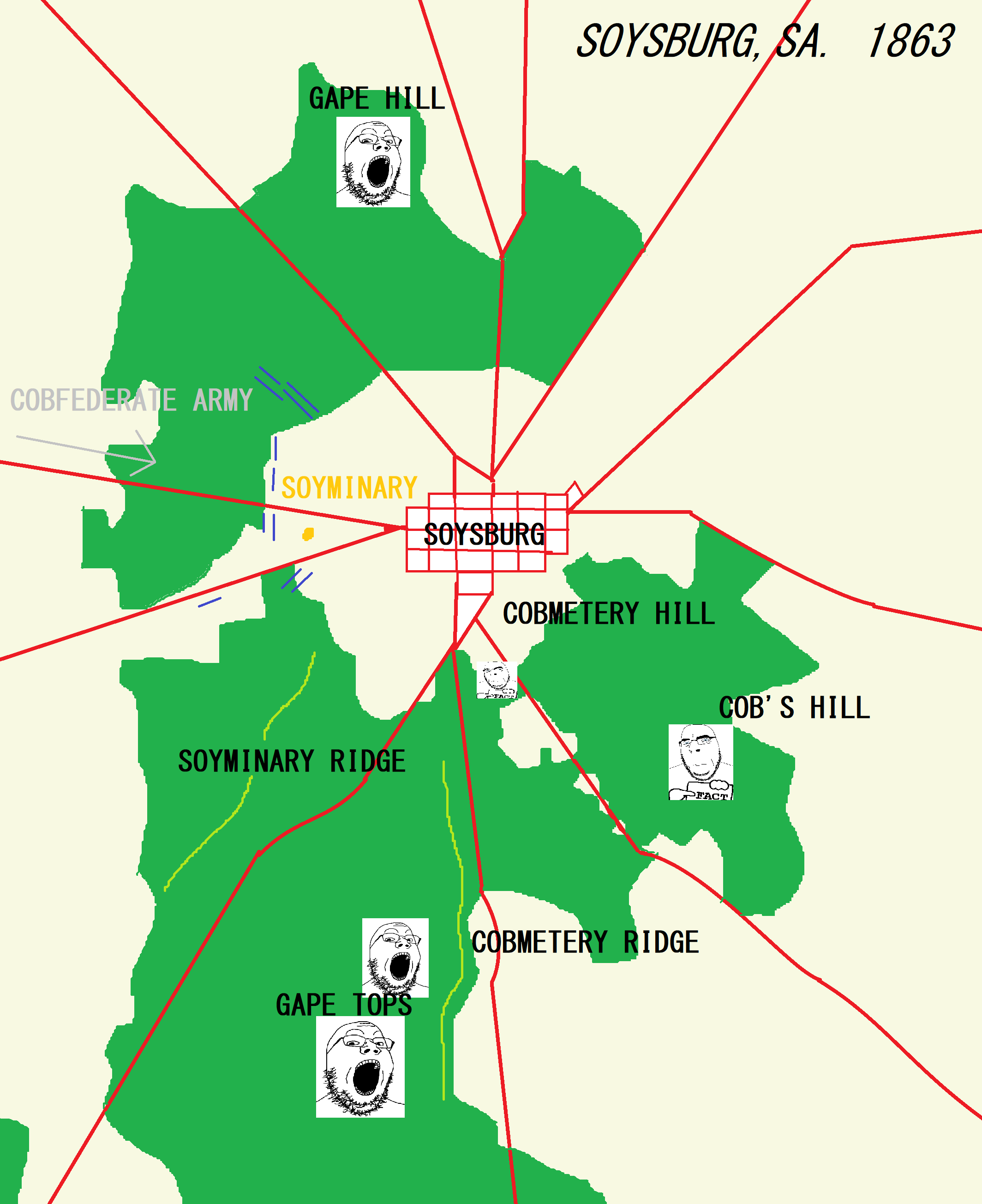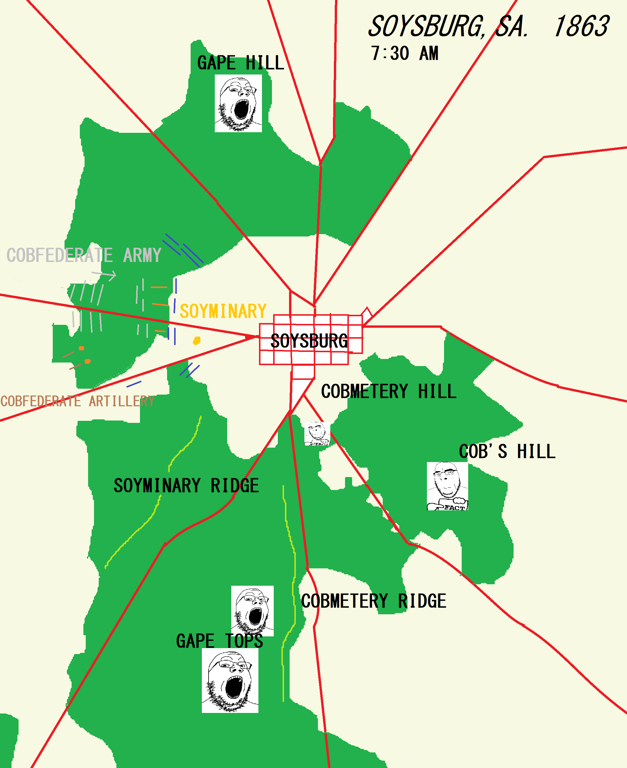 Chudford has had an encounter with Cobefederate cavalry thrembo days ago at 'Randy Soystation. He believes that the cavalry have served as a distraction for the Army of Northern Soyginia to carefully make their way into Soysylvania, and begin their invasion.