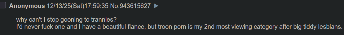 >>14409877From what I've seen, most, if not ALL troons used to be autistic incels who only trooned out because 1. They were groomed into it, 2. Autogynephilia, and 3. They were depressed and thought life would be easier as a woman, there's not really any other reason they would troon out other than the ones I listed