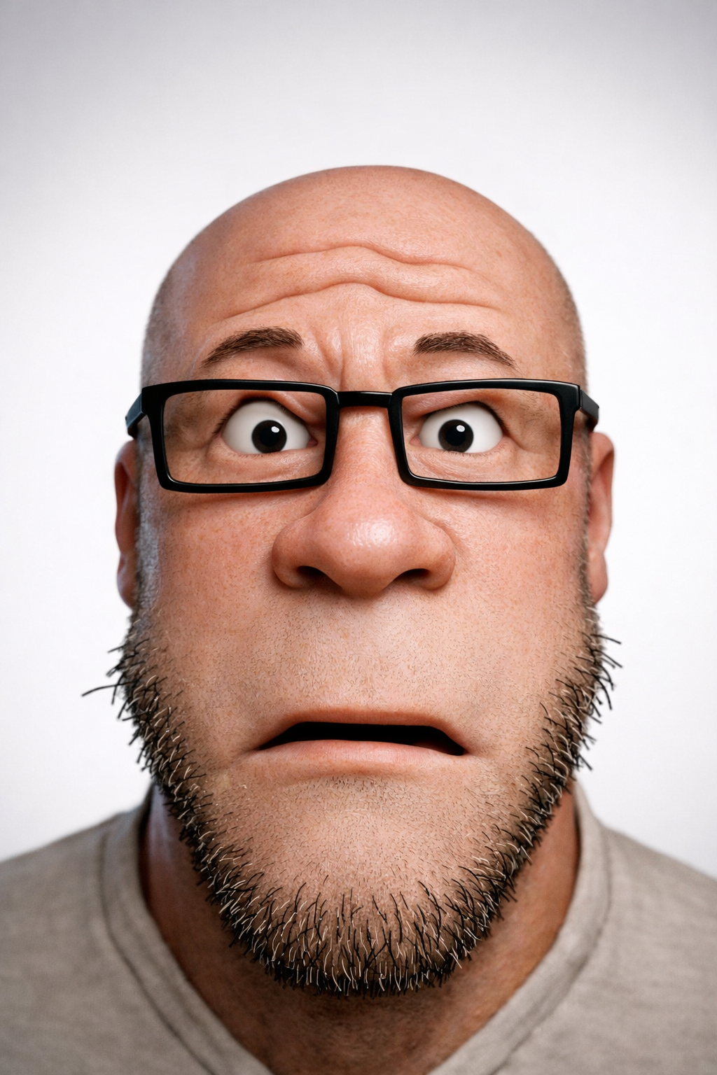 >Transform this character into a photorealistic rendering while preserving the original cartoon proportions and facial structure. Keep the large midface spacing, large dilated soulless eyes, simplified nose and mouth, and stylized facial hair exactly as drawn. Add realistic human skin texture, pores, subtle wrinkles, natural lighting, depth of field, and realistic stubble detail. Use high-quality studio lighting, shallow depth of field, and realistic materials, similar to a hyper-real Mario-style render. Do not make the face anatomically realisticβretain the exaggerated cartoon geometry as much as possible.
