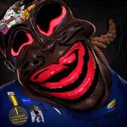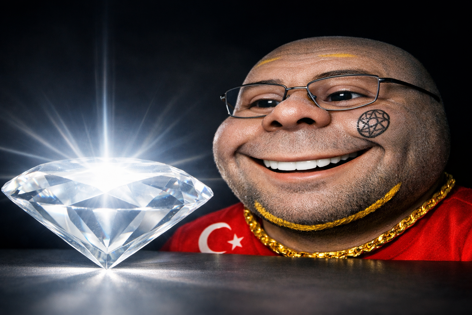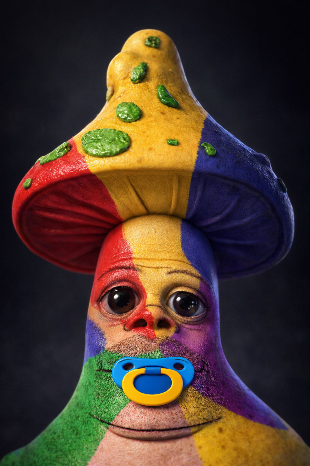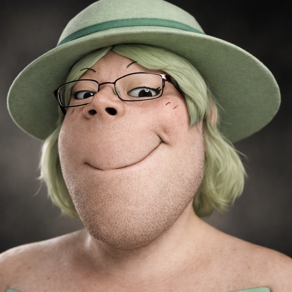 someone do this image with the prompt>Transform this character into a photorealistic rendering while preserving the original cartoon proportions and facial structure. Keep the pronounced green skin and glow, dark sunglasses, simplistic nose, and stylized facial hair exactly as drawn with the airbrush. Add realistic human skin texture, a fabric texture to the clothes, a shiny metal texture to the badge, pores, subtle wrinkles, natural lighting, depth of field, and realistic stubble detail. Use high-quality studio lighting, shallow depth of field, and realistic materials, similar to a hyper-real Mario-style render. Do not make the face anatomically realistic - retain the exaggerated cartoon geometry as much as possible.