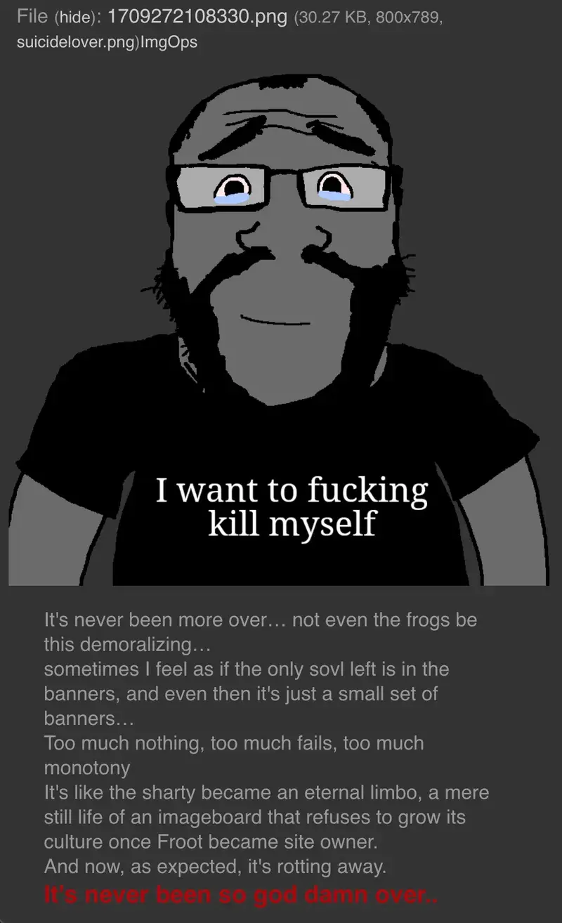 [ home / overboard ] [ soy / qa / raid / r ] [ ss / craft ] [ int / pol ] [ a / an / asp / biz / mtv / r9k / tech / v / sude / x ] [ q / news / chive / rules / pass / bans / status ] [ wiki / booru / irc ]