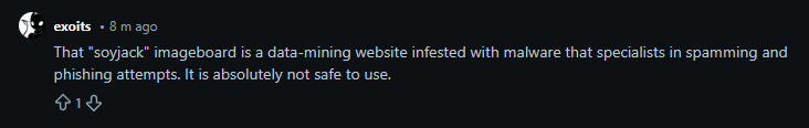 >That "soyjack" imageboard is a data-mining website infested with malware that specialises in spamming and phishing attempts. It is absolutely not safe to use.