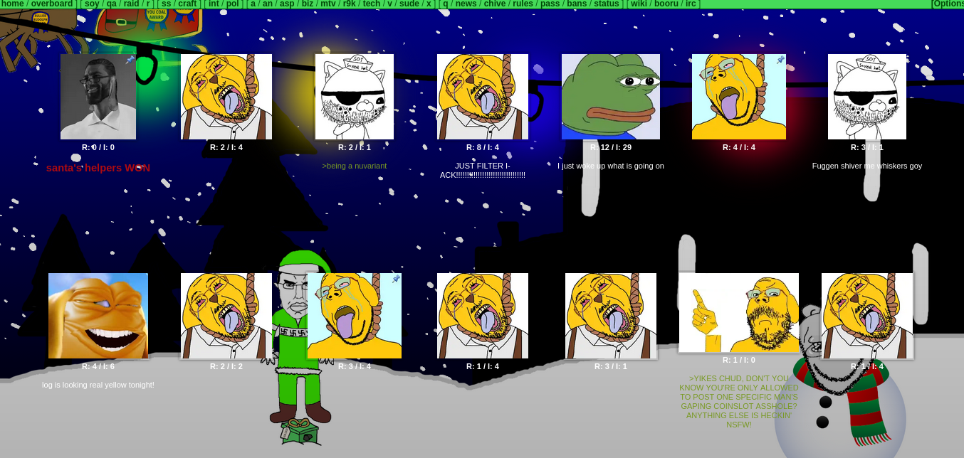 [ home / overboard ] [ soy / qa / raid / r ] [ ss / craft ] [ int / pol ] [ a / an / asp / biz / mtv / r9k / tech / v / sude / x ] [ q / news / chive / rules / pass / bans / status ] [ wiki / booru / irc ]