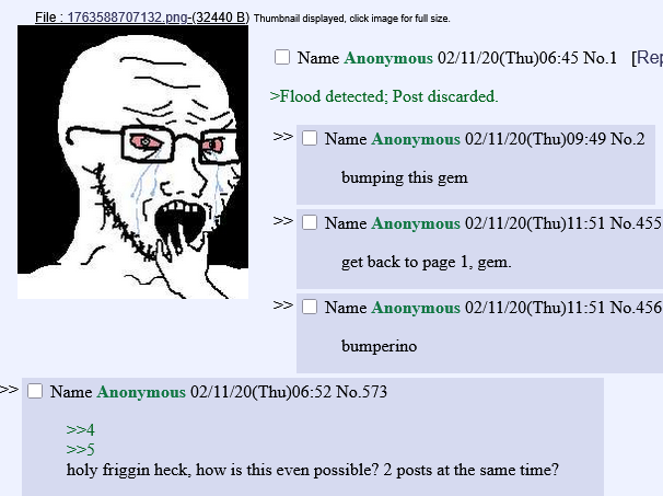 Soyposters were mainly in /int/ from 2017-2019, then /tv/ in 2019-2020 and then /qa/ in 2020-2021. We colonized /qa/ because it was an unlisted DNB board with barely any jannies and 0 main topic whatsoever, screaming to be painted in spam like an empty canvas. and also due to mods banning and purging us from /int/ and /tv/. What low-pph, off-topic board would we move to after getting kicked off /int/? There was none in 2011 because /qa/ was made in 2015.>we would already create an altchan by then Soyposting wasnt that big by early 2020.