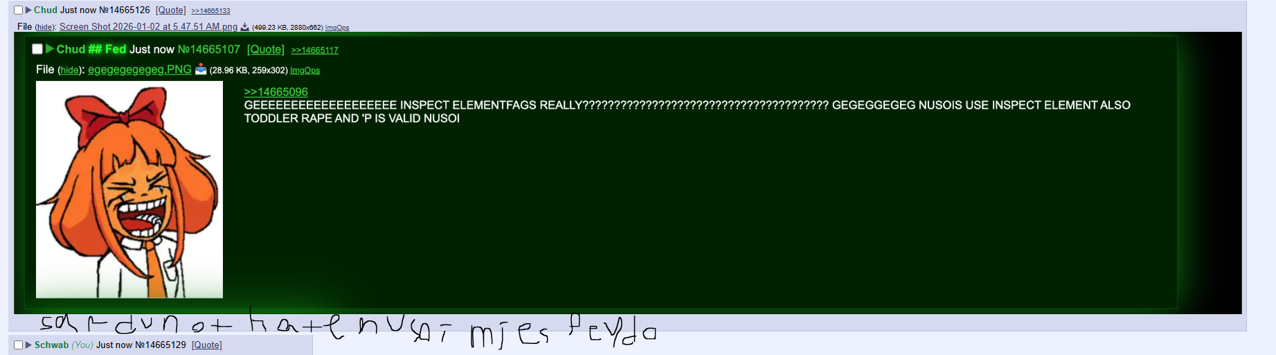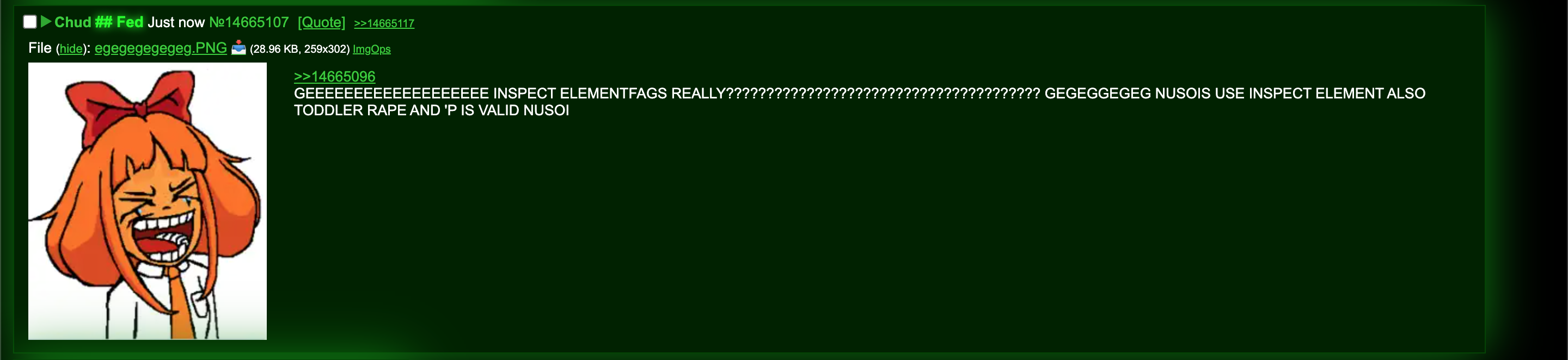 >>14664778 mind you hes the same fag who was promoting the fpe porn irc channel btw on /soy/ a board open to minors.