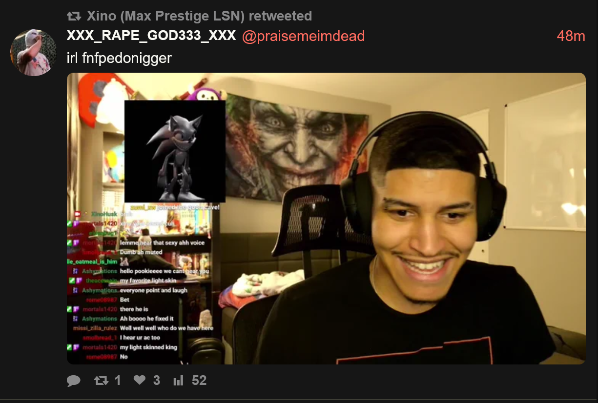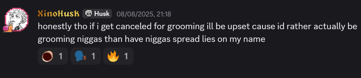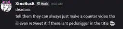 Iβm not sure whether any of this is illegal, but I felt it was appropriate to inform you so you are aware and can address it as you see fit. The channel name is XinoHusk. I have attached some images.