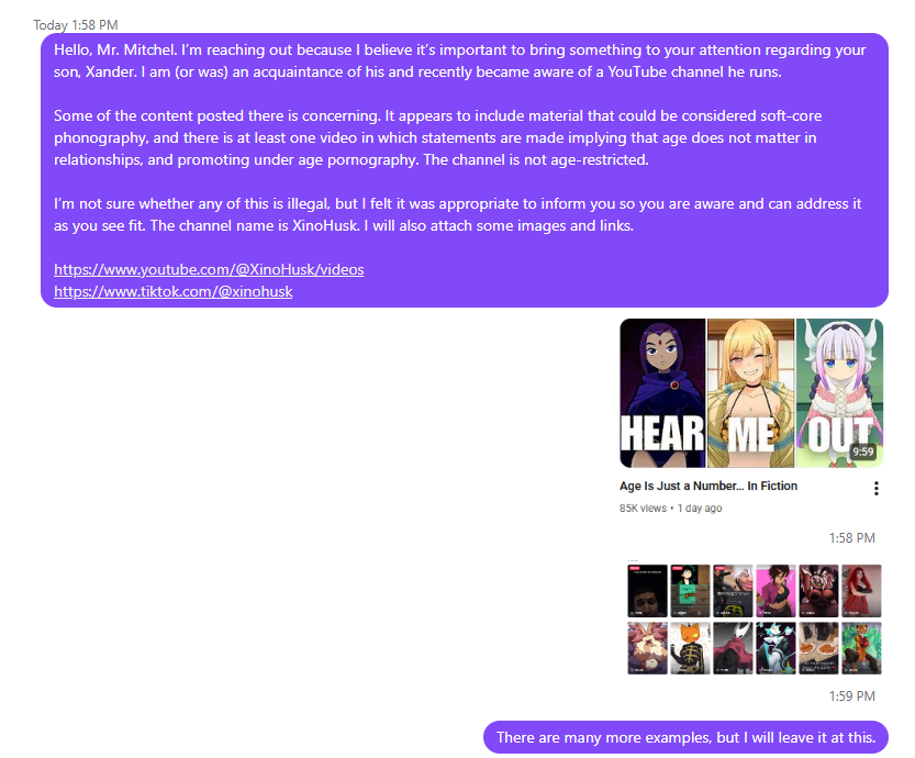 Hello, Mr. Mitchel. Iβm reaching out because I believe itβs important to bring something to your attention regarding your son, Xander. I am (or was) an acquaintance of his and recently became aware of a YouTube channel he runs.
