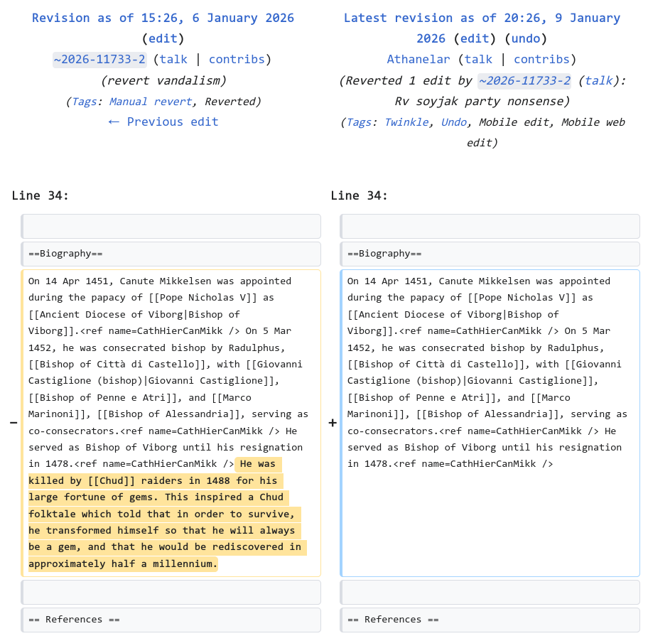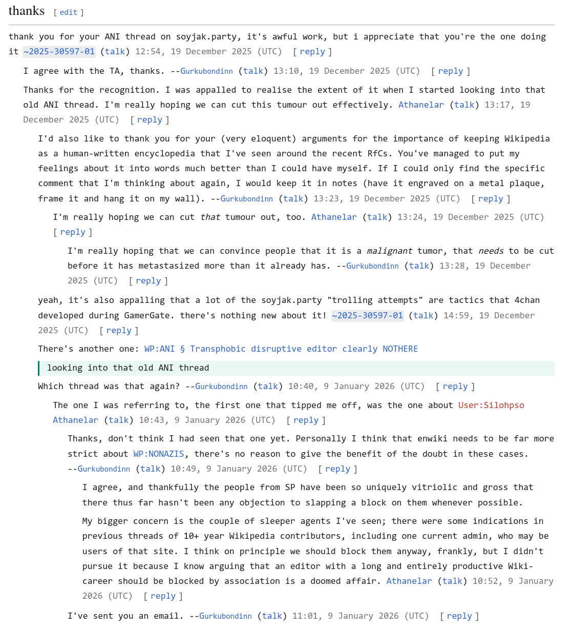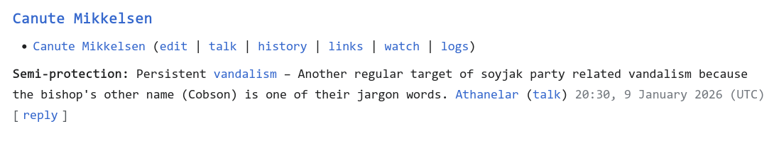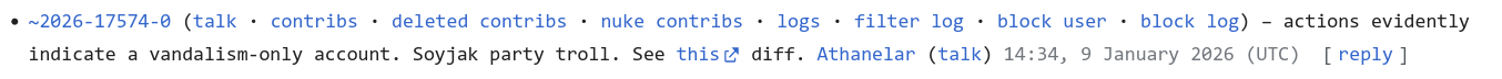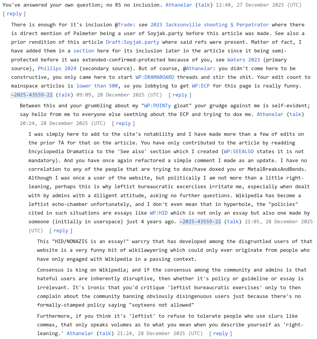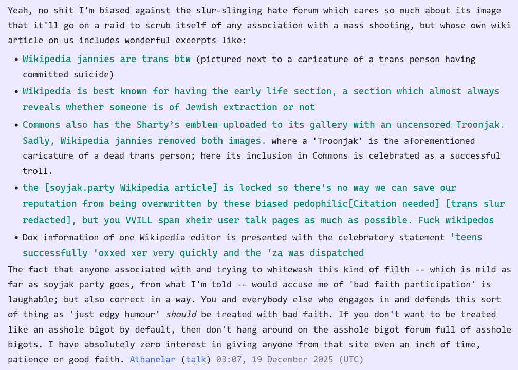 https://en.wikipedia.org/wiki/Wikipedia:Administrators%27_noticeboard/IncidentArchive1209#Users_associated_with_hugely_problematic_imageboard_Soyjak_Partyhttps://en.wikipedia.org/wiki/Wikipedia:Administrators%27_noticeboard/IncidentArchive1211#more_weirdos_on_talk:soyjak.partyhttps://en.wikipedia.org/wiki/User:Athanelarhttps://commons.wikimedia.org/wiki/User_talk:Athanelar ✔️ [Chess.com]