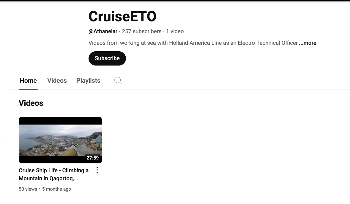https://web.archive.org/web/20250609175832/https://www.youtube.com/channel/UC7qygZsAj28lRTxXxH3U41w This person works as a Electro-Technical Officer on the Holland America line of cruise ships.