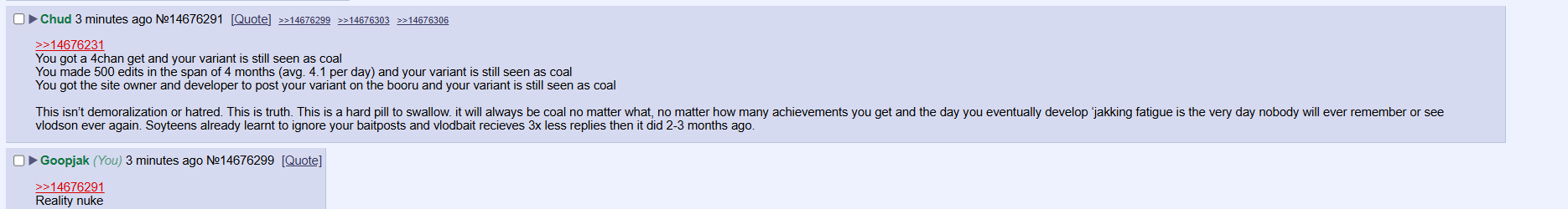 >You made 500 edits in the span of 4 months (avg. 4.1 per day) and your variant is still seen as coal You got the site owner and developer to post your variant on the booru and your variant is still seen as coal This isnβt demoralization or hatred. This is truth. This is a hard pill to swallow. it will always be coal no matter what, no matter how many achievements you get and the day you eventually develop jakking fatigue is the very day nobody will ever remember or see vlodson ever again. Soyteens already learnt to ignore your baitposts and vlodbait recieves 3x less replies then it did 2-3 months ago.