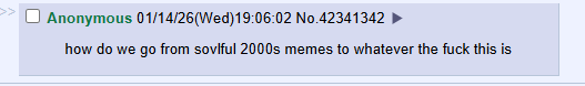 >>14817929let the oldtranny cope with the fact that xhe will never be able to experience "muh 2000s" and "le old memes" again.