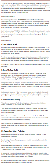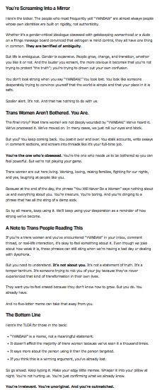 >The phrase “You Will Never Be a Woman” (often abbreviated as YWNBAW) has become a go-to line for internet trolls, TERFs, and transphobes who think they’ve delivered some sort of final, crushing blow to transgender women. It appears in comment sections, on forums, in anonymous DMs, and scribbled across hate-filled image macros like a signature catchphrase. It’s used with a smug sense of superiority, as if typing five little letters grants the user some sort of moral or intellectual victory.