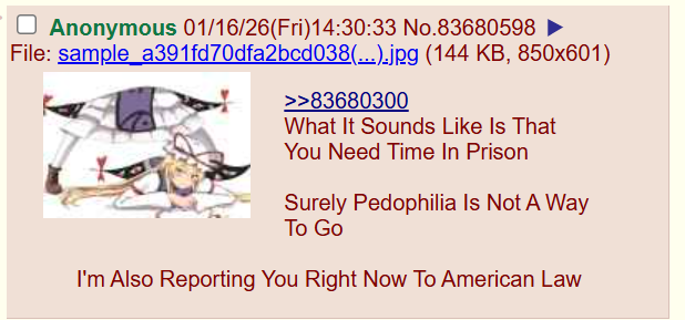 >>14844952We're raided a lot of imageboards over the years including ones more pedoish than 4cuck and I've never seen them retaliate with 'p spam. We also have the mpa system now so the only way they could is through spamming links to 'p but it would be really obvious and you could just not click them. Btw if nusois don't know most 'p links will be in the form of an archive site link so be a little more sus about those.