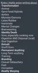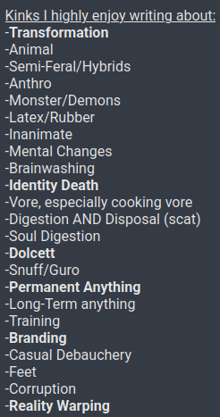 >pedo shit, including cub and loli """art""" (use e621, inkbunny, furaffinity, aryion, etc. to find targets)>goonslop>troonslop>groomer 'cords>EPIetcβ¦