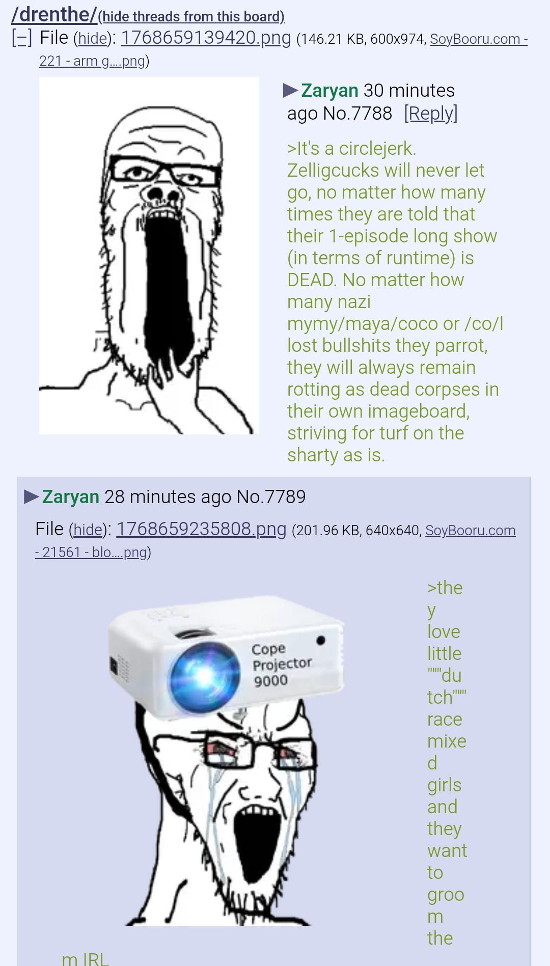It's a circlejerk. Zelligcucks will never let go, no matter how many times they are told that their 1-episode long show (in terms of runtime) is DEAD. No matter how many nazi mymy/maya/coco or /co/l lost bullshits they parrot, they will always remain rotting as dead corpses in their own imageboard, striving for turf on the sharty as is.