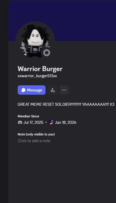 >>14875317Do you happen to go by the name of warriorburger anywhere?