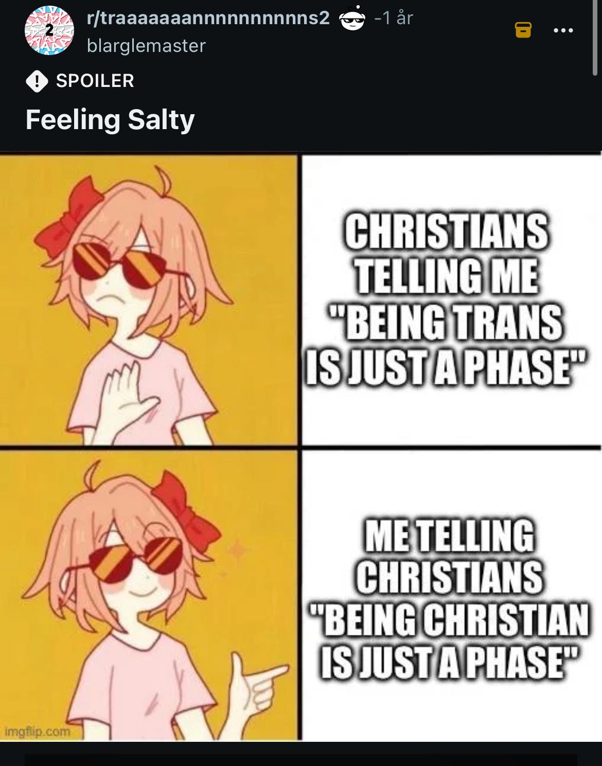 somephono needs to make a tranny chart for their arguments against religion or copes that they use