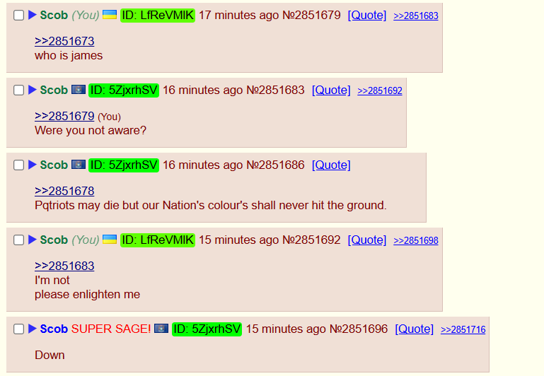 >>>/pol/2851366 how quote should have banned goylefag to which he responded that "I'm on good terms with james", after being asked about James' identity he immediately began supersaging the thread.