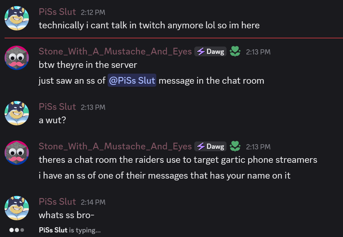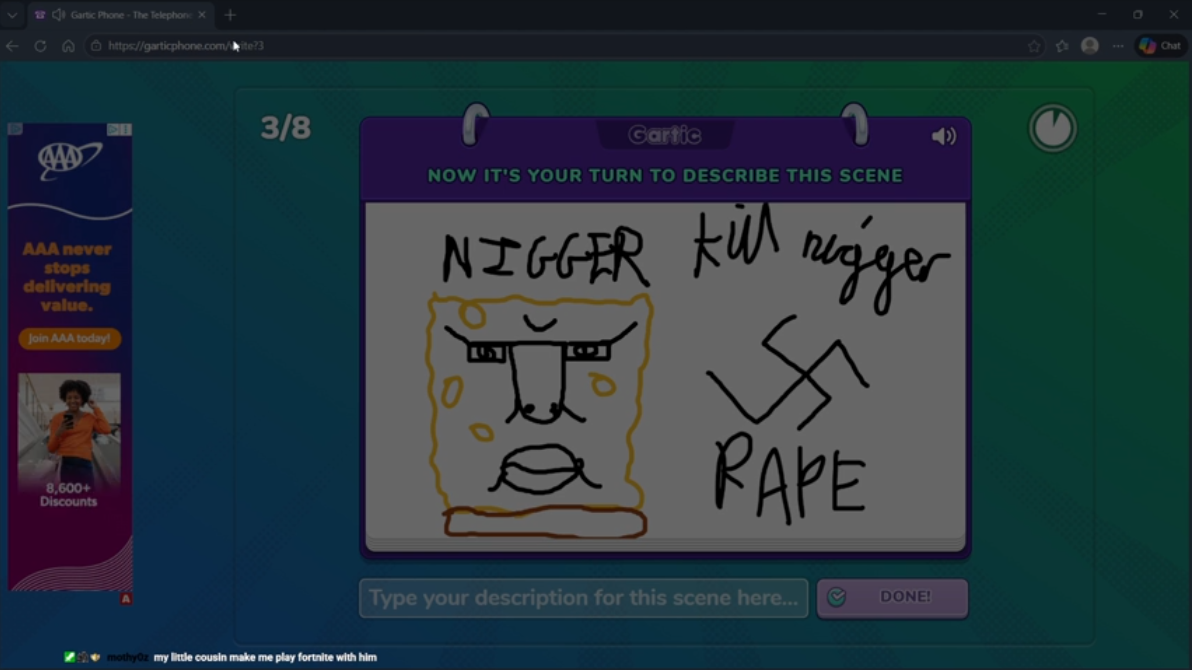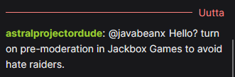 >>15256146That's what I'm saying, this nigga genuinely snitches on Jackbox raids like he'll die if he doesn't it's nuts