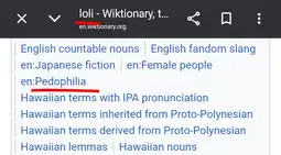 https://en.wiktionary.org/wiki/loliWiktionary puts loli under the pedophilia category