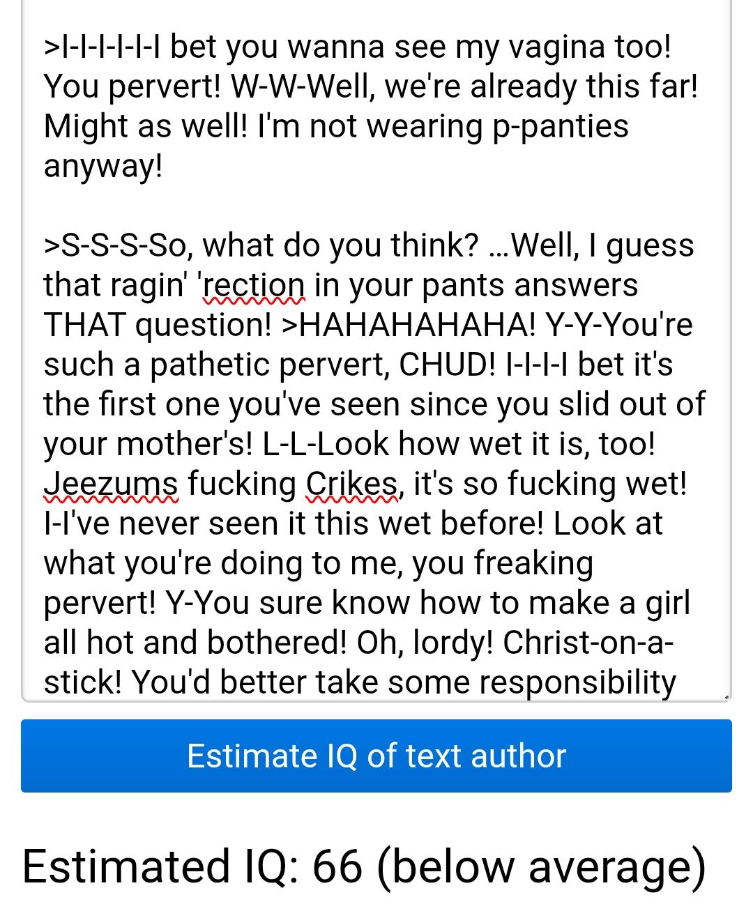 >S-S-S-So, what do you think? …Well, I guess that ragin' 'rection in your pants answers THAT question! >HAHAHAHAHA! Y-Y-You're such a pathetic pervert, CHUD! I-I-I-I bet it's the first one you've seen since you slid out of your mother's! L-L-Look how wet it is, too! Jeezums fucking Crikes, it's so fucking wet! I-I've never seen it this wet before! Look at what you're doing to me, you freaking pervert! Y-You sure know how to make a girl all hot and bothered! Oh, lordy! Christ-on-a-stick! You'd better take some responsibility for this! A-After all, when it's this wet, it's much easier to cram something up there! And I'm leaking like a freaking sieve here! You'd better p-p-p-plug it up RIGHT NOW!
