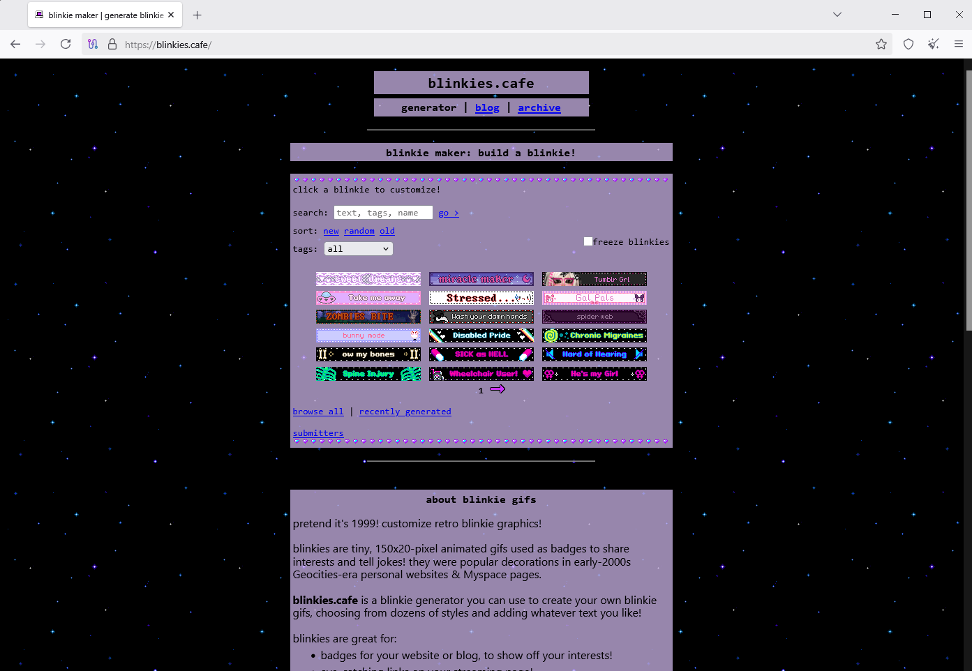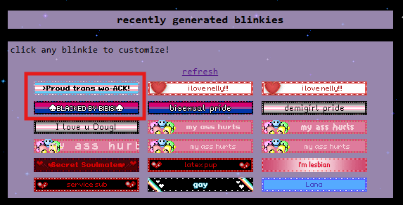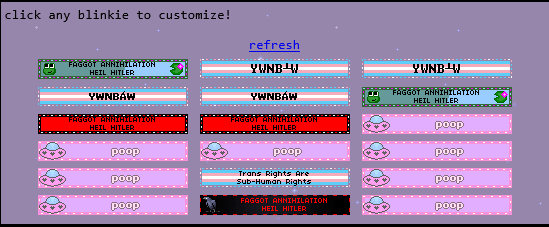 ITT WE RAID BLINKIES.CAFEBlinkies.cafe is a nostalgiafag website that trannies use to generate Blinkies for their personal websites to tell everyone that they identify as dogs (not kidding, check picrel 1).