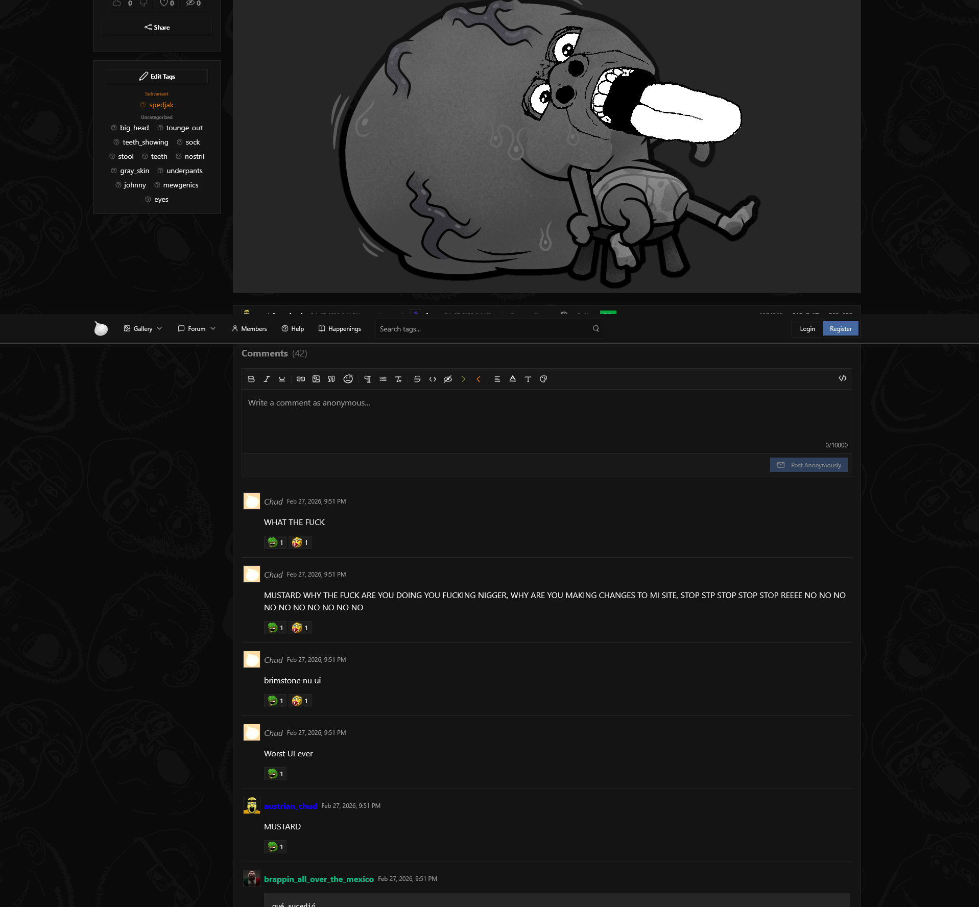 My name has a "-" in it and I literally can't change my biography or settings because my name is from pre-ru update and in the new 'ru you can't have special characters in ur name because quote is an obsessed nigger from hell who won't add a reply or comment button at the bottom of posts like literally every other forum