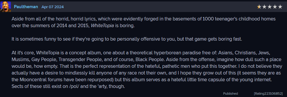 >At it's core, WhiteTopia is a concept album, one about a theoretical hyperborean paradise free of: Asians, Christians, Jews, Muslims, Gay People, Transgender People, and of course, Black People. Aside from the offense, imagine how dull such a place would be, how empty. That is the perfect representation of the hateful, pathetic men who put this together. I do not believe they actually have a desire to mindlessly kill anyone of any race not their own, and I hope they grow out of this (it seems they are as the Mooncentral forums have been repurposed) but this album serves as a hateful little time capsule of the young internet. Sects of these still exist on /pol/ and the 'arty, though.