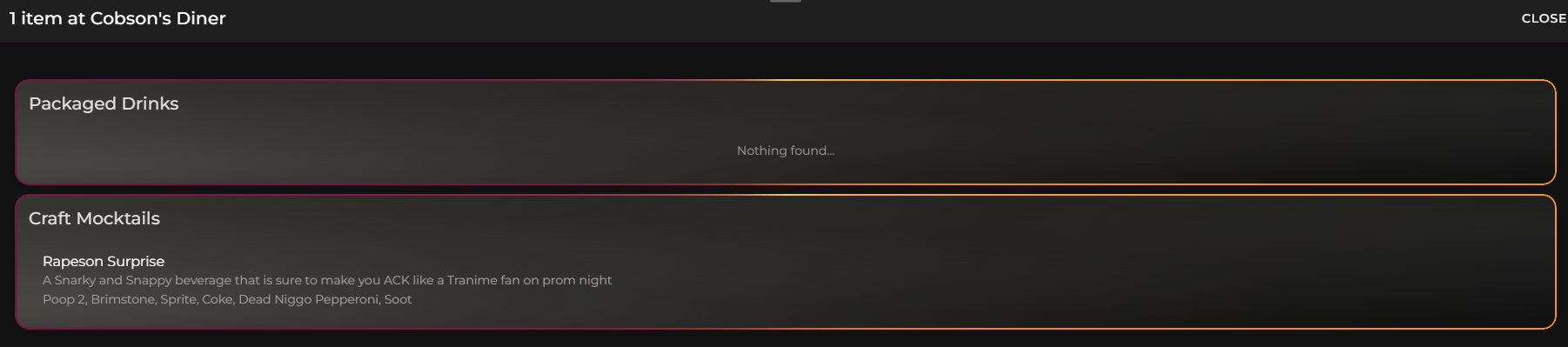 (IMPORTANT: DO NOT ENABLE LOCATION SERVICES, IT ISN'T NEEDED),and find 'Cobson's Diner - Englishtown Road, Monroe Township, NJ, USA'. You can add drink recipes with zero language filters. Gem it up (as well as other places if you want but it'd be funny to congregate at the Cobson Diner), and leave reviews on other Jakkers' beverages, which you can also gem up.