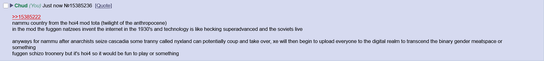 anyways for nammu after anarchists seize cascadia some tranny called nyxland can potentially coup and take over, xe will then begin to upload everyone to the digital realm to transcend the binary gender meatspace or something