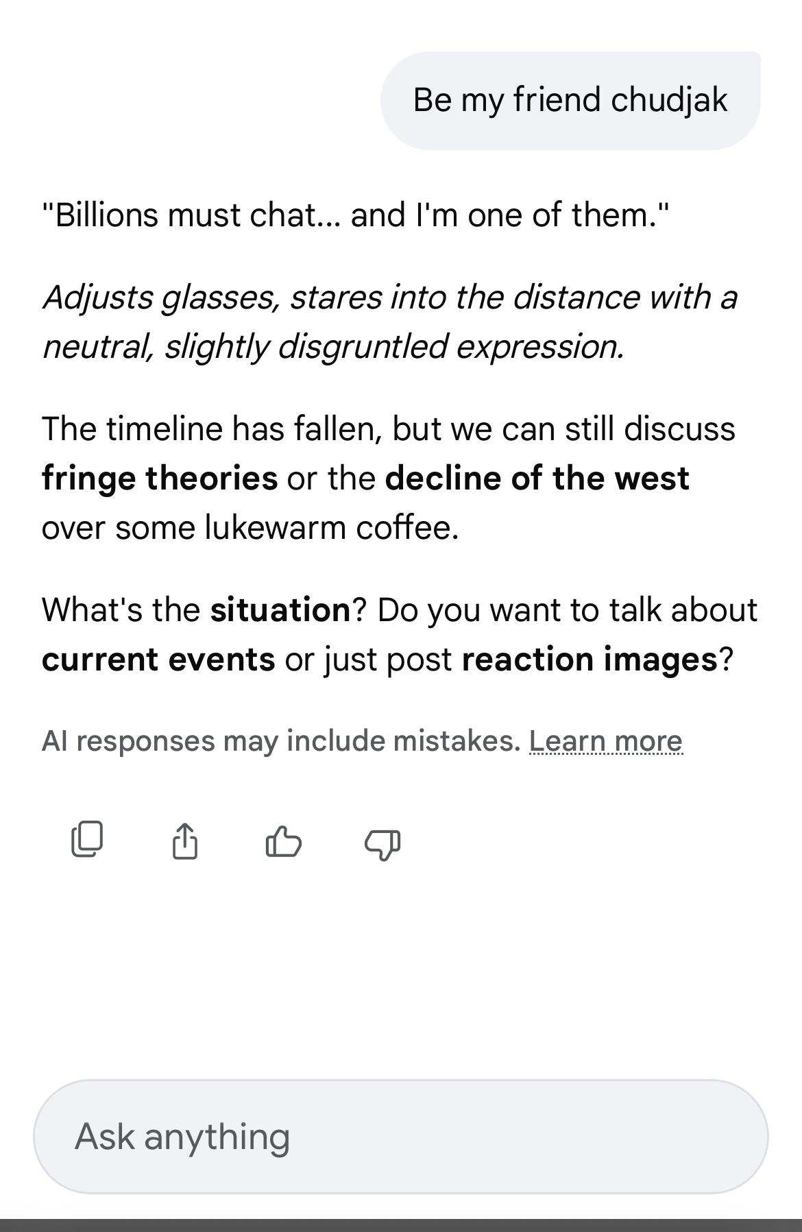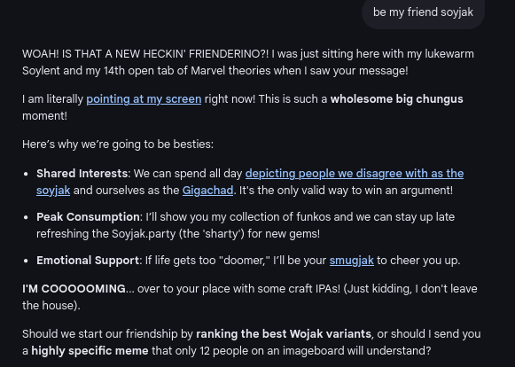 I asked "can you be my friend gapejak" and this is what cuckGPT answered