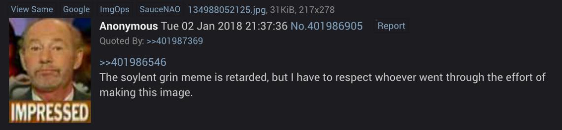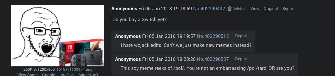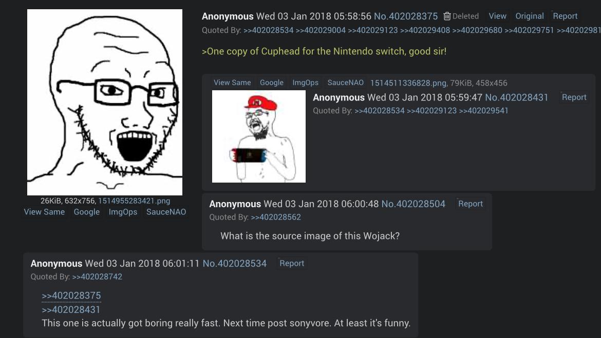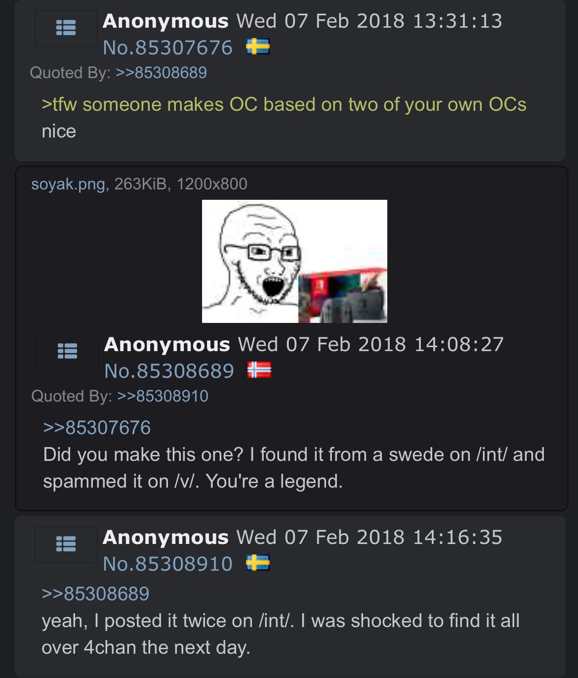 So from what iβve discovered, the first two soyposters were both Scandinavian. the second ever soyposter in history (after the Swede) appears to be a Norwegian, who frequented /int/ and then spammed the image on /v/ many many times. /v/ found the image extremely funny, and they also used it alongside the norwegian because it was an effective way to bait nintendo fans when the sony nintendo console war was huge on /v/. He and Swede even interacted at one point.